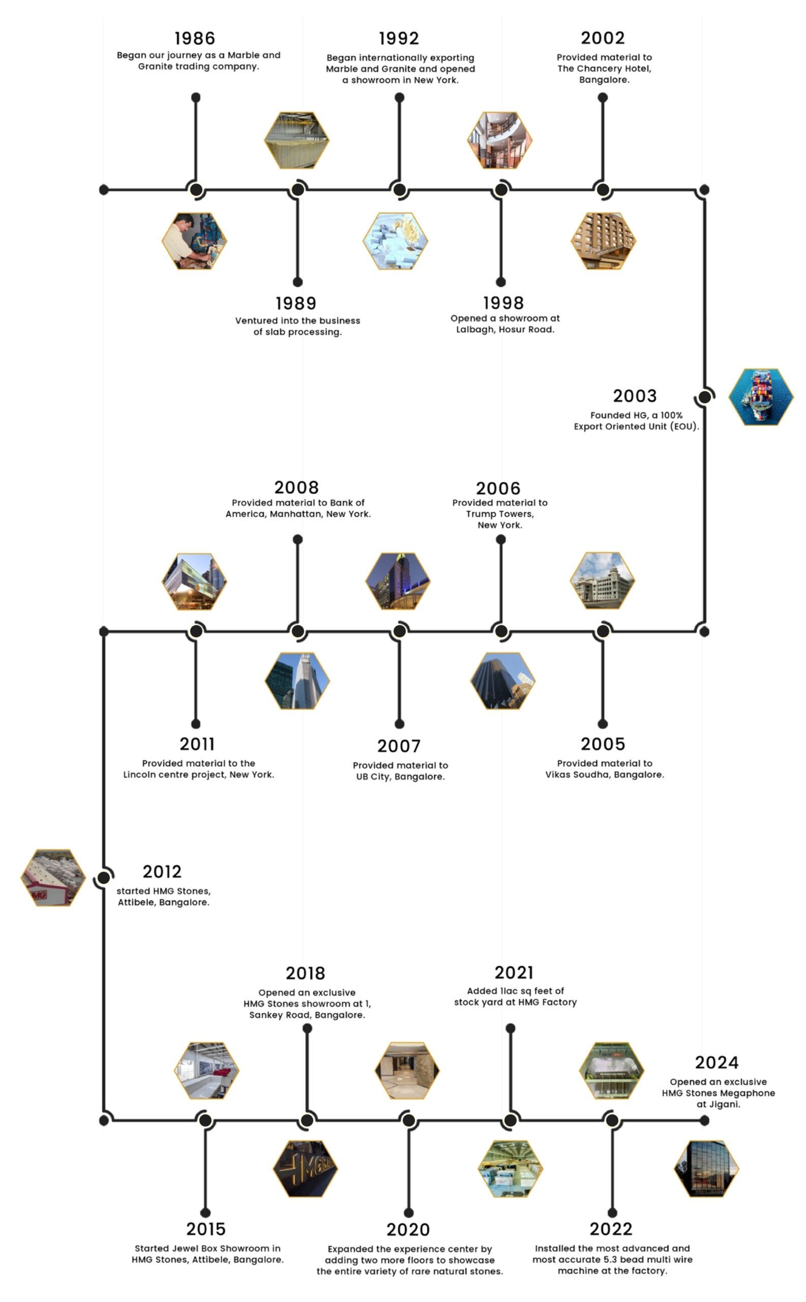 What started off as a Marble and Granite trading company in 1986, known as Hindustan Marble and Granite eventually led to the establishment of HMG Group by Mr. Anand Reddy. With his industrial expertise, he transformed the company and now operates its processing factory, a showroom and an experience centre focused on nature and all its miracles through the display of exquisite stones.